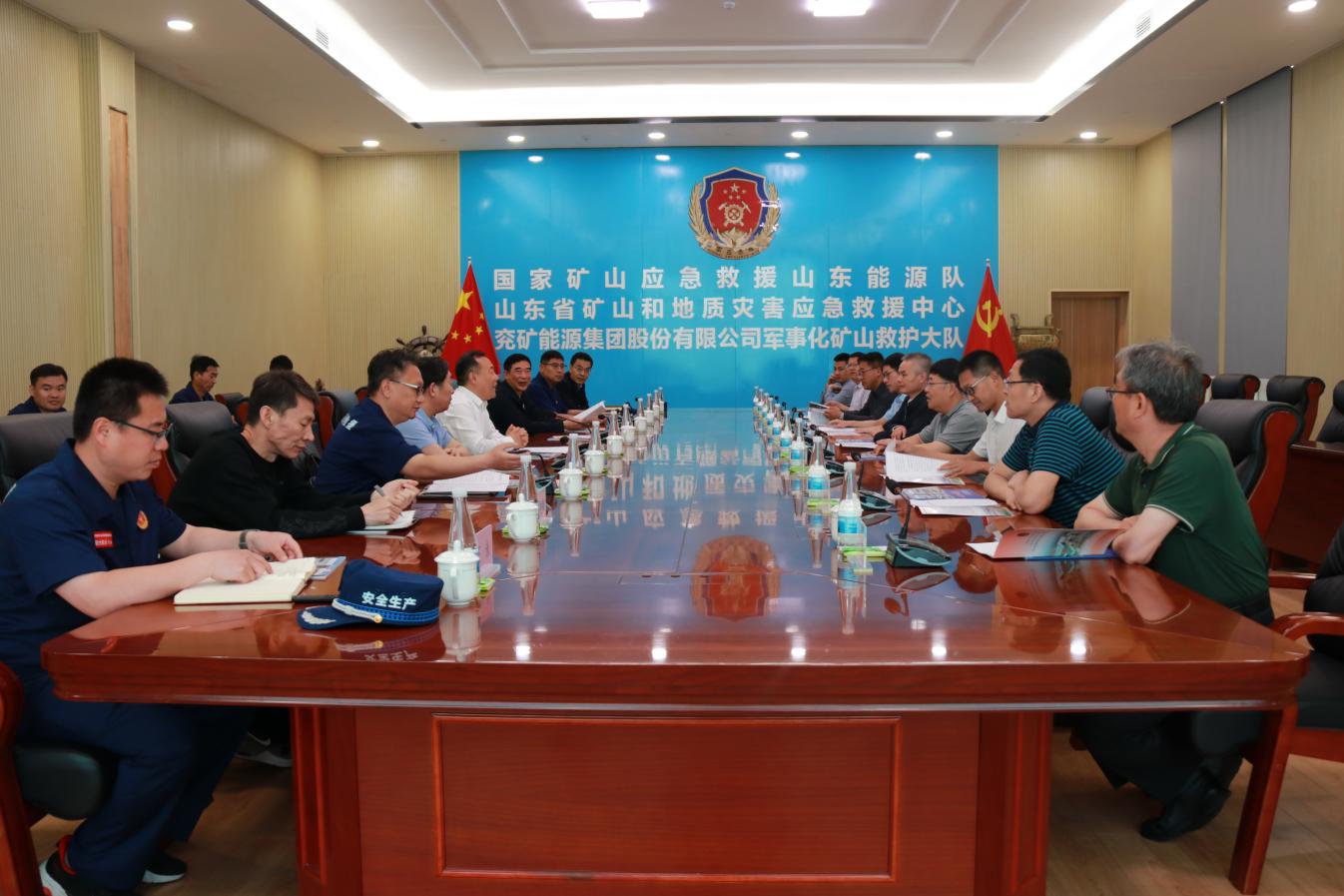在调研座谈会上,山东能源集团安全总监吴向前介绍了能源集团应急救援工作开展情况,大队长任晓东通过PPT展示了国家矿山应急救援山东能源队建设情况。通过深入座谈交流,调研组对山东省矿山和地质灾害应急救援中心项目建设和山东能源队作战能力建设取得的成绩给予了充分肯定,对山东能源队积极参加重大灾害救援抢险、主动履行社会责任给予了高度赞扬。