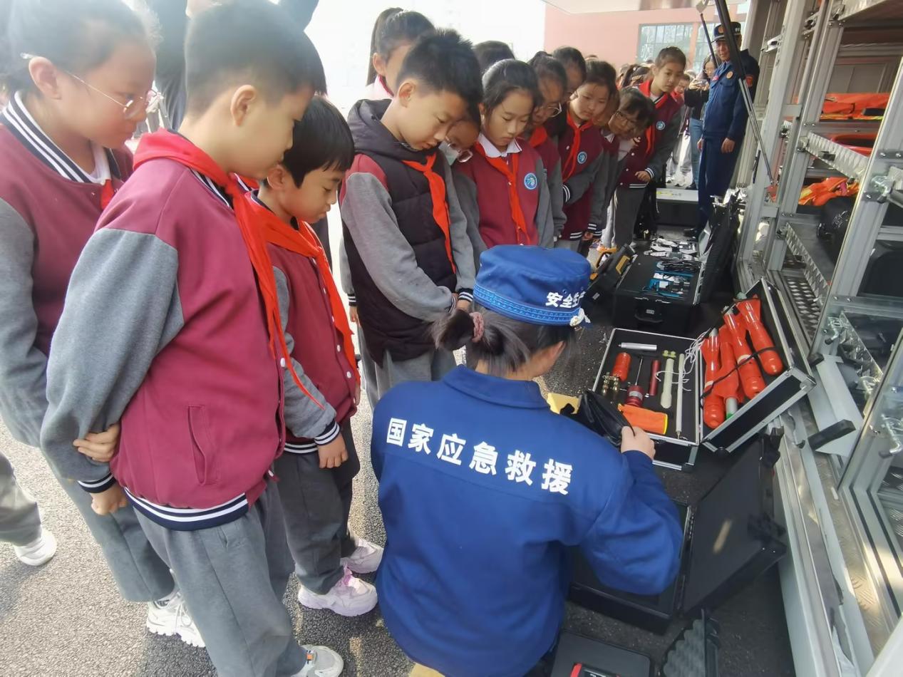 演练结束后,大家一起前往装备展示区,参观了扩剪两用钳、侦察无人机、电锯、人体搜寻仪、蛇眼探测仪、救生抛投器等各种器材装备。救援队员现场展示了扩剪两用钳、侦察无人机的操作。