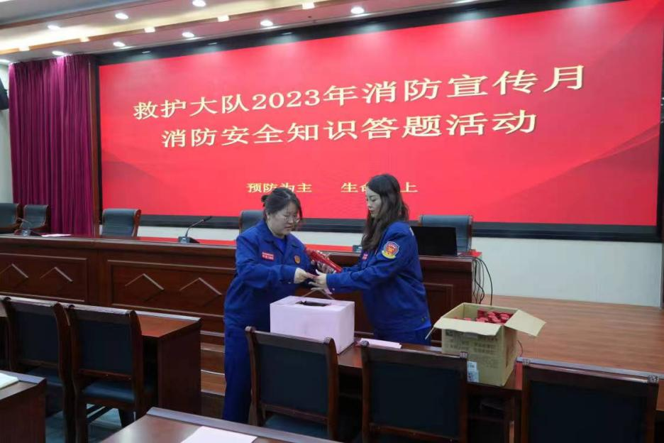 大队精心组织本部一、七中队和机关科室人员,开展消防安全知识培训和消防安全知识答题活动,进一步提高救护大队全体指战员的消防安全意识和自防自救能力,真正把关注消防、学习消防、参与消防落到实处。(李鹏)