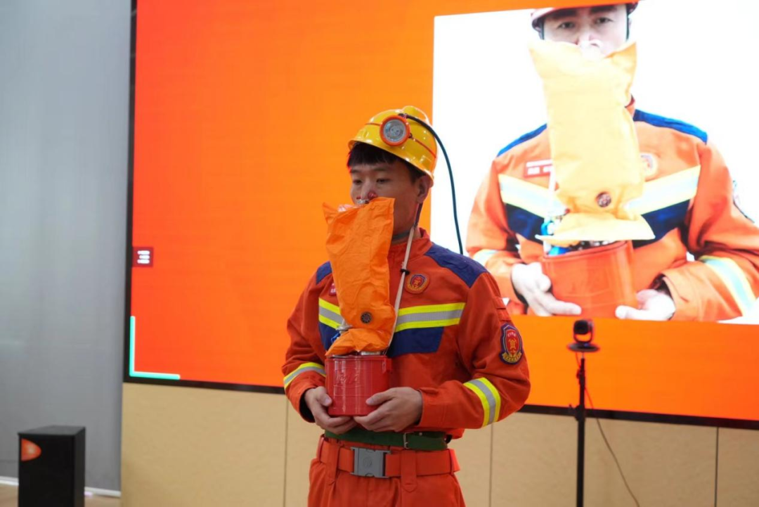 战训科尤洪利通过PPT的形式,从矿用自救器的用途、矿用自救器的分类、压缩氧自救器和化学氧自救器设计及工作原理、佩戴与使用6个方面向大家讲解了压缩氧自救器和化学氧自救器的工作原理、使用方法以及使用过程中有关注意事项,在讲到使用方法时,两名指战员配合讲解内容分别进行了实操展示,让大家更加直观的进行了学习。