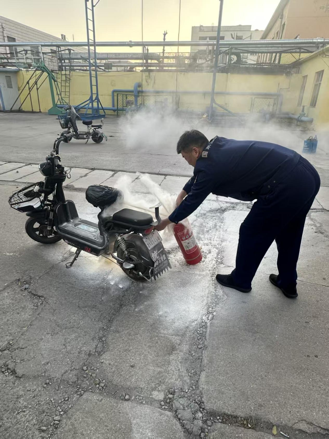 专业处置,迅速控火。在浓烟与高温中,陈健沉着冷静,熟练操作灭火器对准火焰根部持续喷射,有效压制火势。经过数分钟紧张扑救,明火被彻底扑灭。随后,他又细致检查现场,确保无复燃可能,最终化险为夷。整个过程有条不紊,展现了扎实的消防技能和应急处置能力。