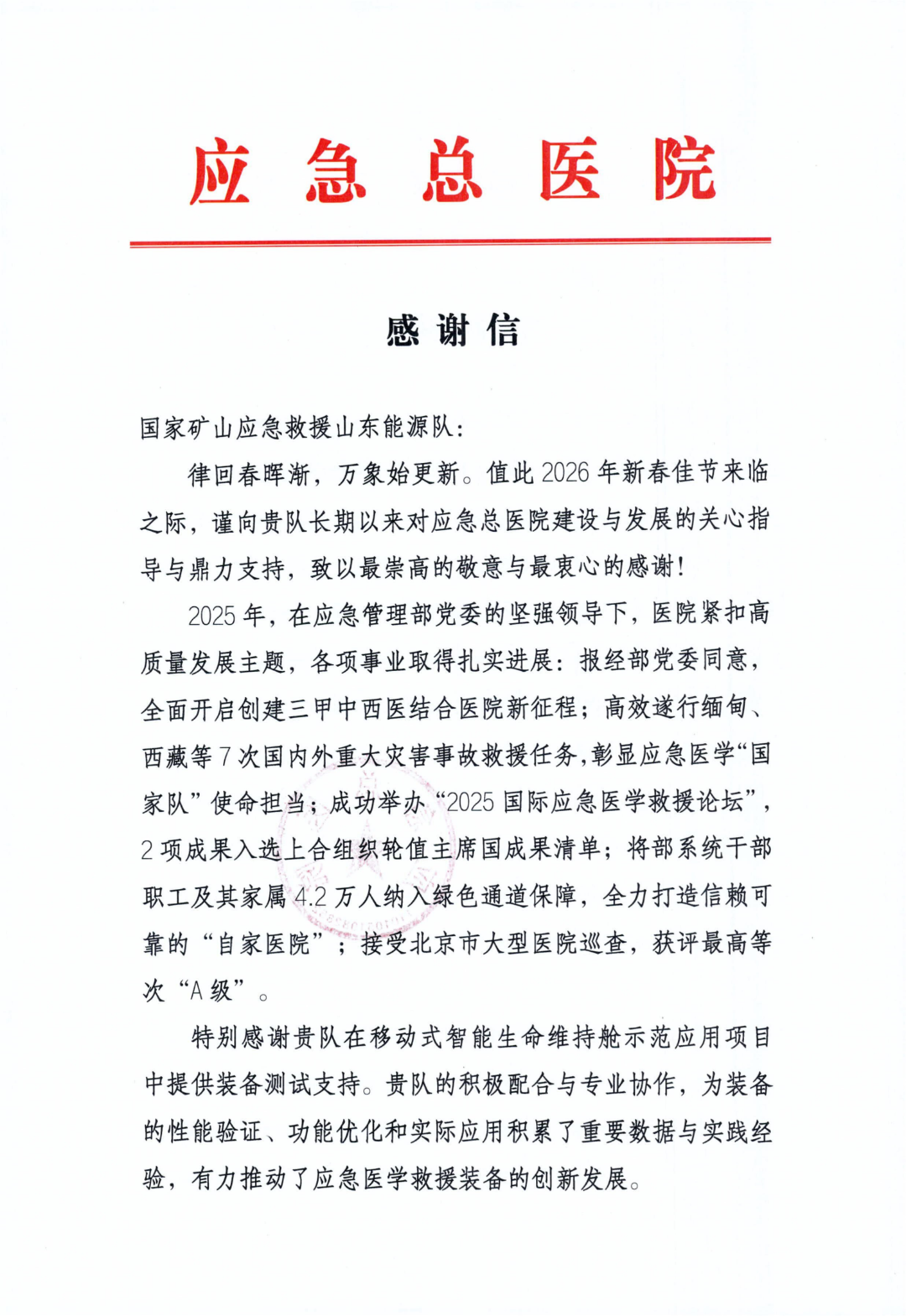 感谢信指出,在应急管理部党委的坚强领导下,应急总医院在2025年紧扣高质量发展主题,各项事业取得扎实进展。信中特别强调,在应急总医院开展的“移动式智能生命维持舱示范应用项目”中,山东能源队提供了关键的装备测试支持。山东能源队的积极配合与专业协作,为装备的性能验证、功能优化和实际应用积累了宝贵的数据与实践经验,有力推动了应急医学救援装备的创新发展。
